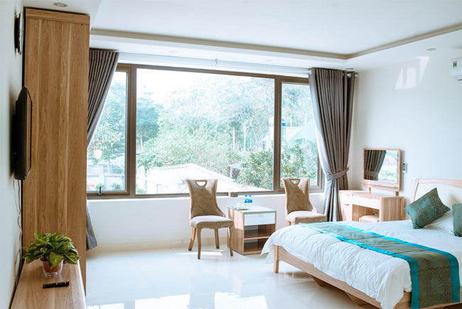 Phòng rộng 30 mét vuông, xây theo phong cách Châu Âu hiện đại, rộng rãi, thoáng mát, view đẹp nhìn ra núi Ba Vì.